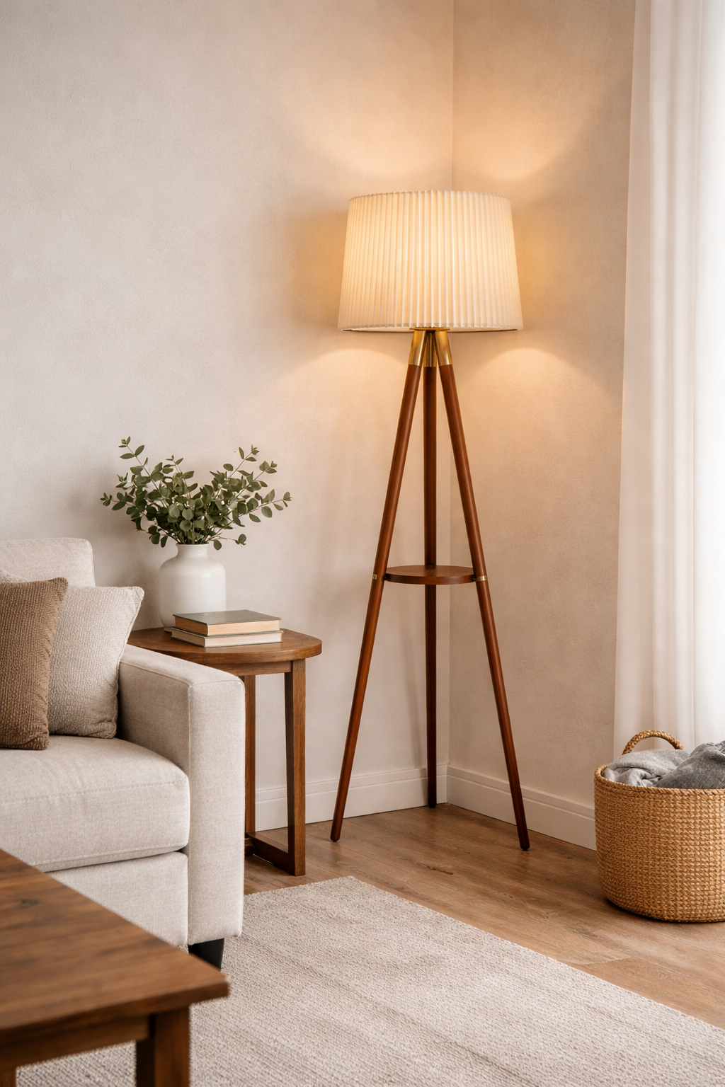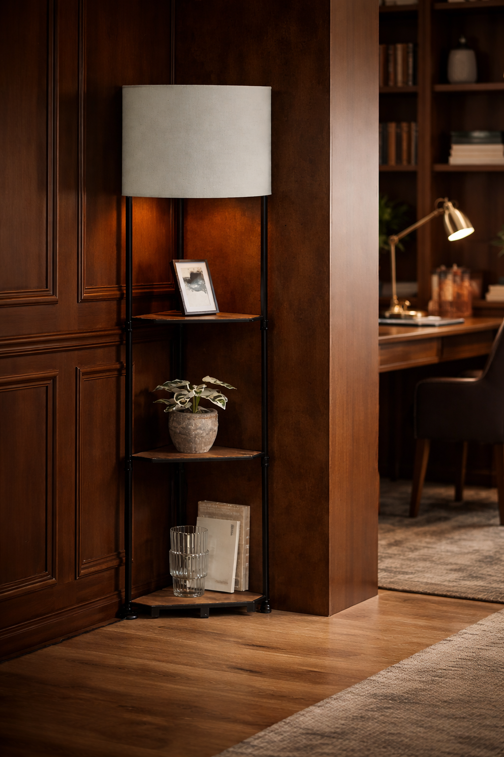 BROWN CORNER WOOD SHELF FLOOR LAMP